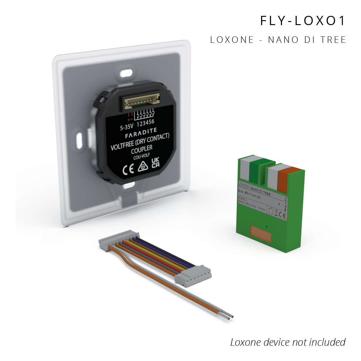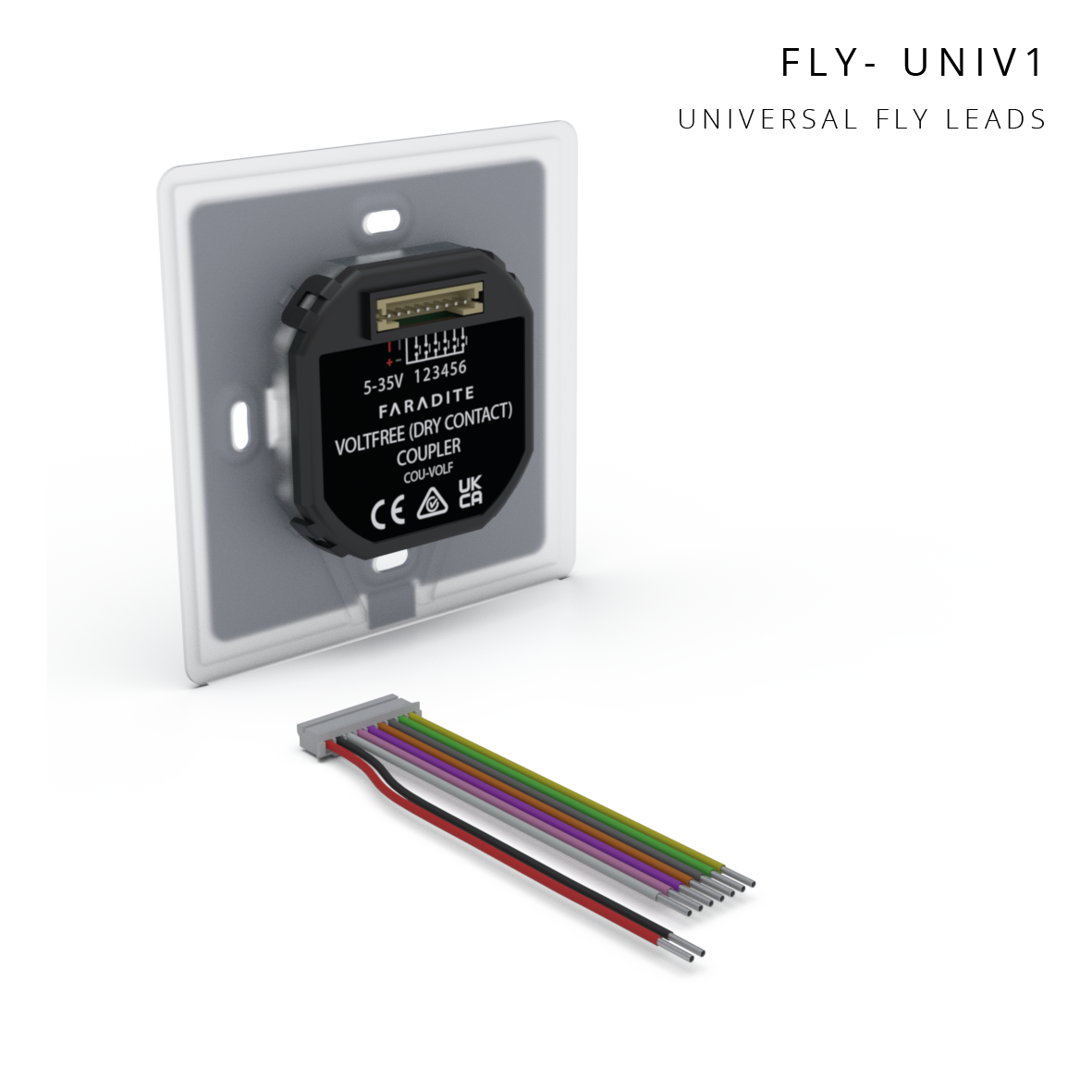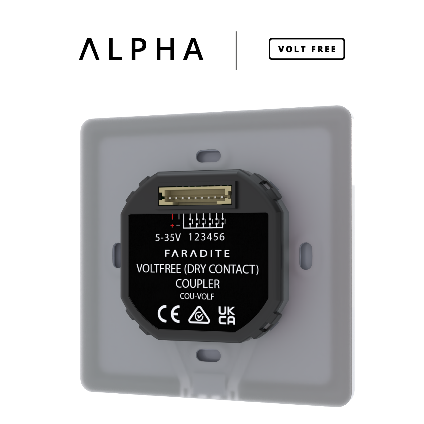 A full TAP-5 ALPHA Volt Free switch comprises a front plate, a volt free coupler, and any one of the available fly leads