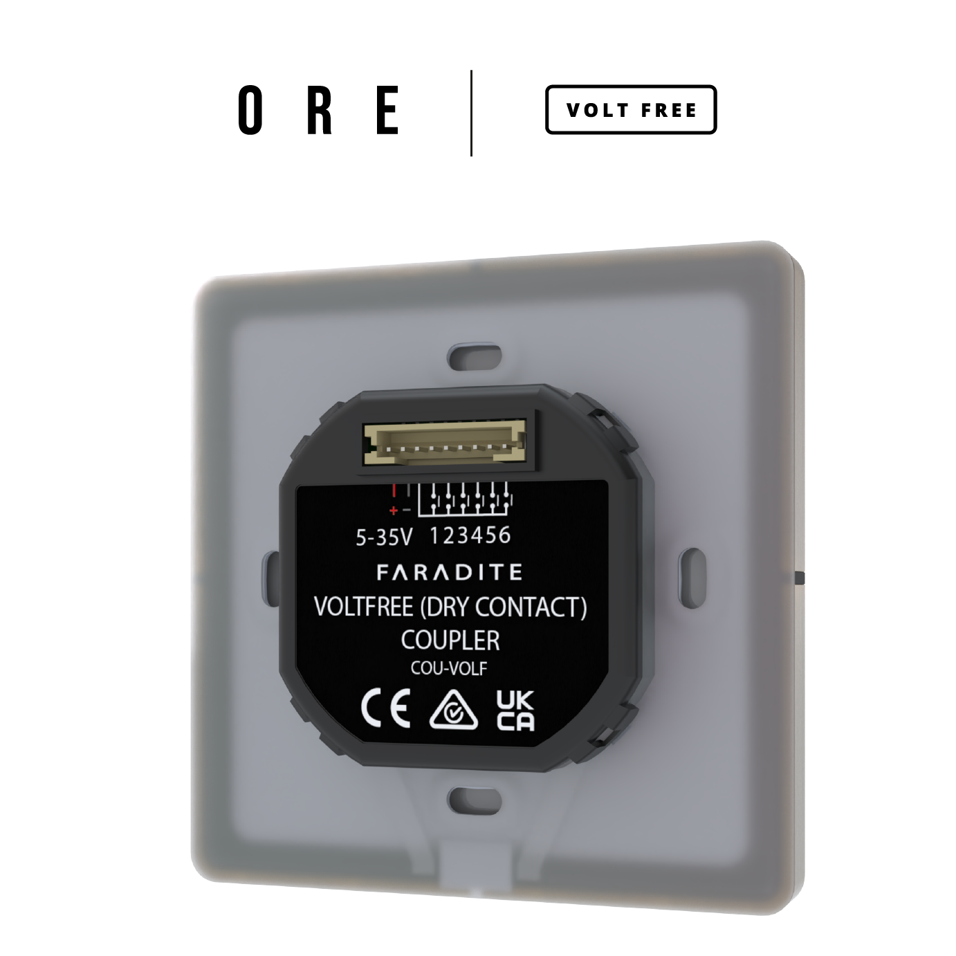 A full TAP-5 ORE Volt Free switch comprises a front plate, a volt free coupler, and any one of the available fly leads